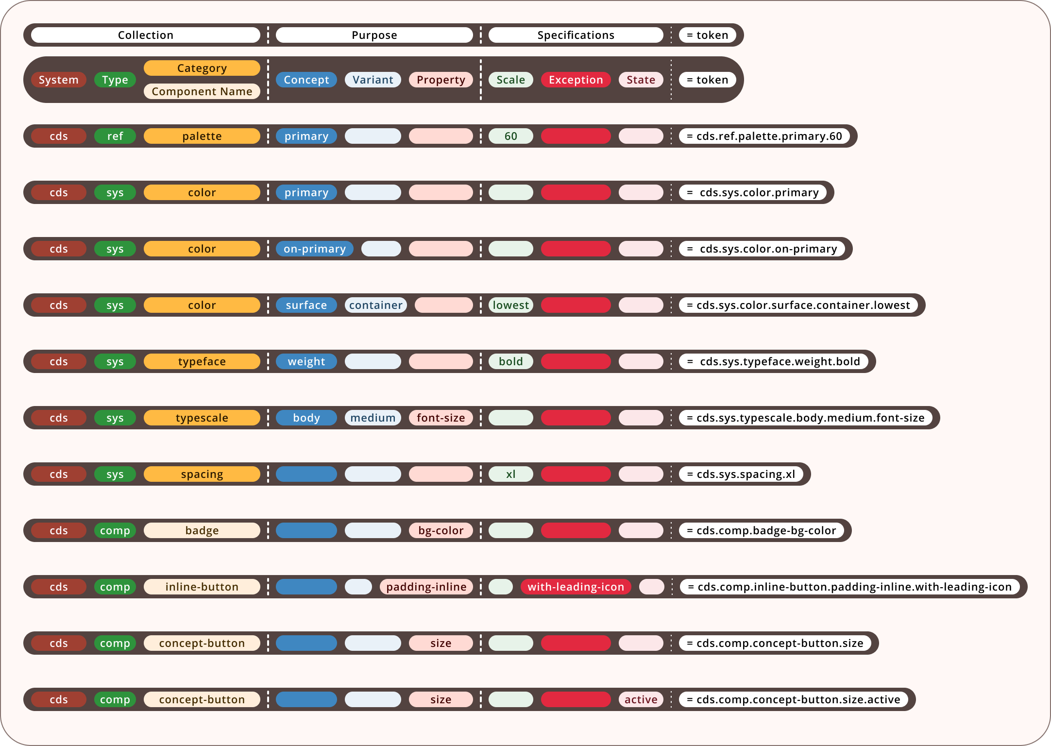 Bijvoorbeeld, primary in cds.ref.palette.primary.60 is een concept dat aangeeft dat het token betrekking heeft op de primaire kleur in het systeem.